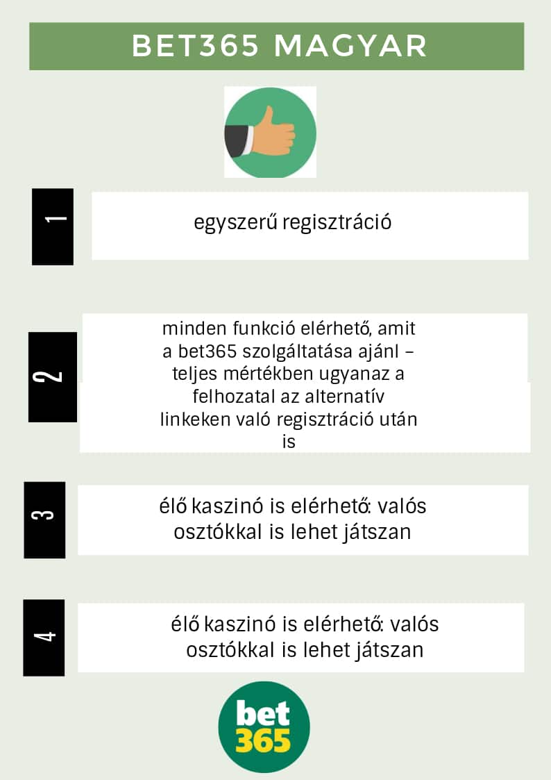 - Mivel a bet365 elérése gyakran blokkolt Magyarországról, ezért az esetek döntő többségében, szerintem egy bet365 alternatív link mindenképp szükséges ahhoz, hogy végrehajtható legyen a regisztráció, elérhetőkké váljanak a bónuszok & promóciók, és rendelkezésre álljanak az online szerencsejáték platform nyújtotta funkciók, illetve szolgáltatások.